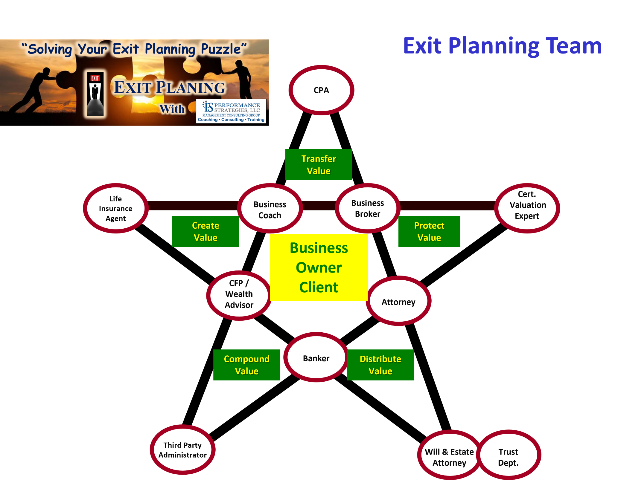 As an Owner that is planning the Exit / Transition of your business, you need many or all of the following professionals: